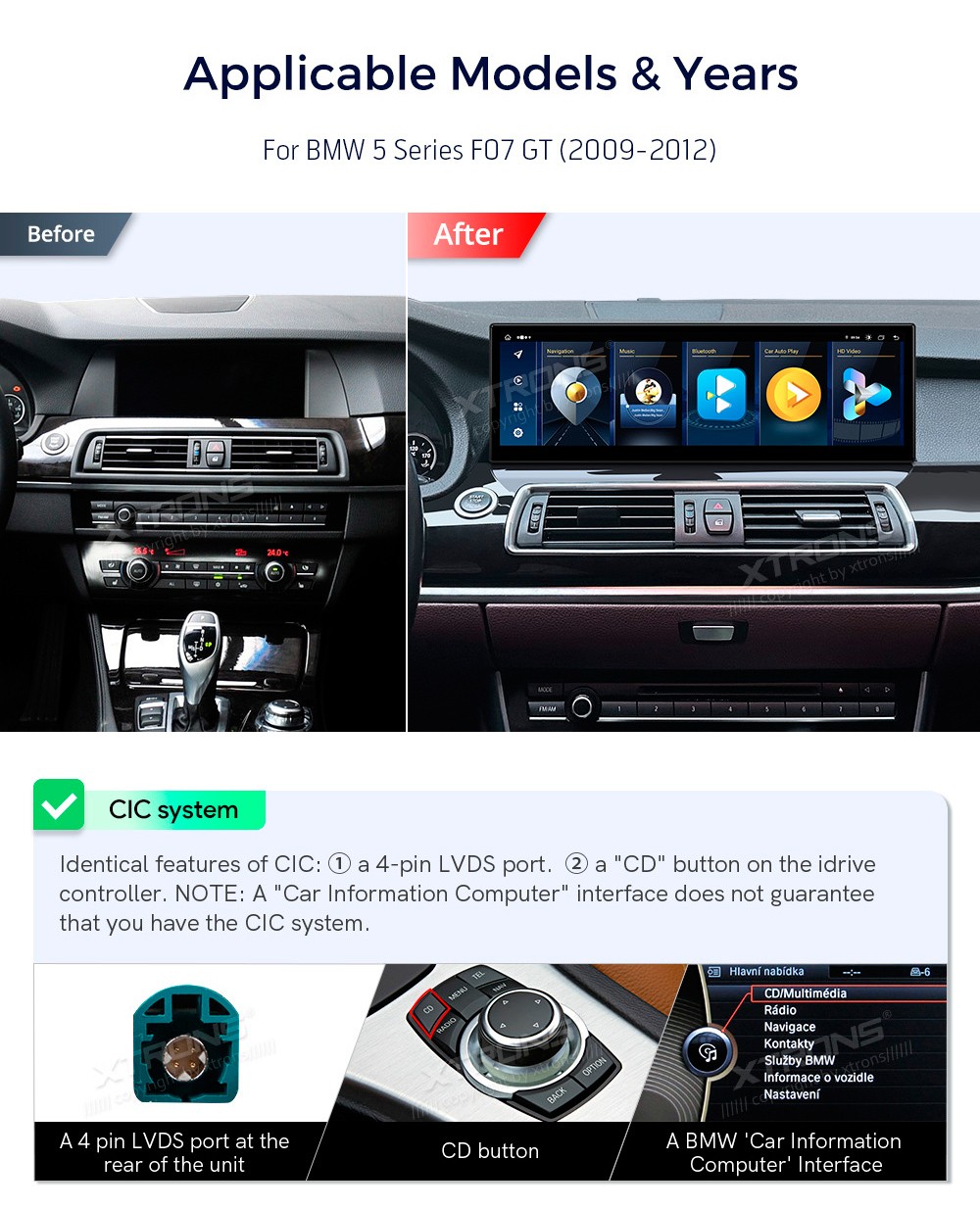 XTRONS QLBX44FVCIGT3 14.9" BMW 5 Seeria F07 GT CIC Multimeedia Android 14.0 Octa-Core 4G BMW 5 Seeria F07 GT (2009-2012) (Sobib, kui sõidukil on CIC süsteem.)Tarkvara: Android 14.014.9" 1920*1080px, IPS G+G HD puuteekraanProtsessor Octa-Core 2x Cortex-A75 + 6x Cortex-A55 64bitMuutmälu LPDDR4 8GB, eM ...Lisaseadmed