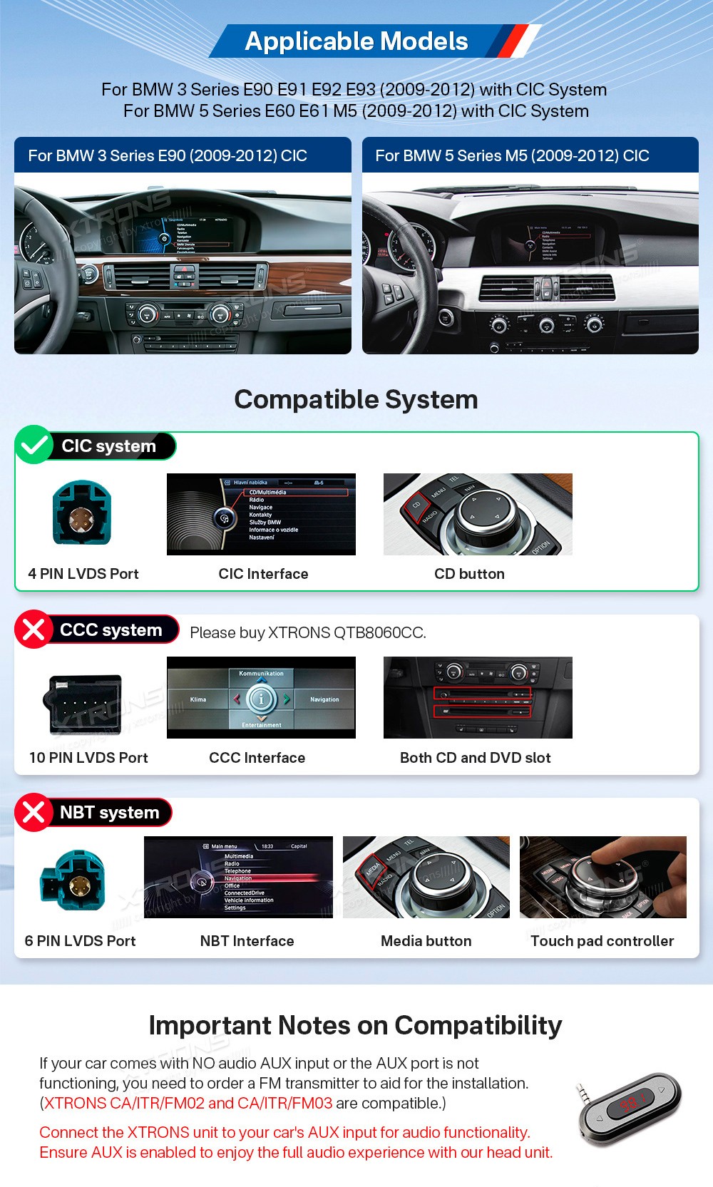 XTRONS QTB8060CI 8.8" BMW 3, 5 Seeria E60, E90 CIC Multimeedia Android Octa-Core BMW 3 Series E90, E91, E92, E93 (2009-2012)BMW 5 Series E60, E61, M5 (2009-2012)(Sobib, kui sõidukil on CIC süsteem.)Tarkvara: Android8.8" HD puuteekraan 1280*480px, IPS HDProtsessor Cortex A-53 Octa-Core 64bitMuutmälu ...Lisaseadmed