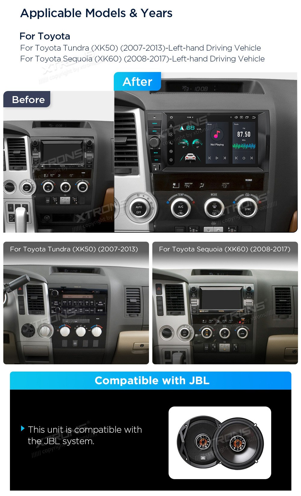 XTRONS PX94TDTLGS 9.0" TOYOTA Tundra, Sequoia Multimeedia Android 14.0 Octa-Core 4G TOYOTA Tundra (XK50) (2007 - 2013)TOYOTA Sequoia (XK60) (2008 - 2017)Tarkvara: Android 14.09.0" HD puuteekraan 1280*720px, G+GProtsessor Octa-Core 2.2GHz 64bitMuutmälu DDR4 4GB, eMMC 5.1 64GB sisemäluGPS Navigat ...Lisaseadmed