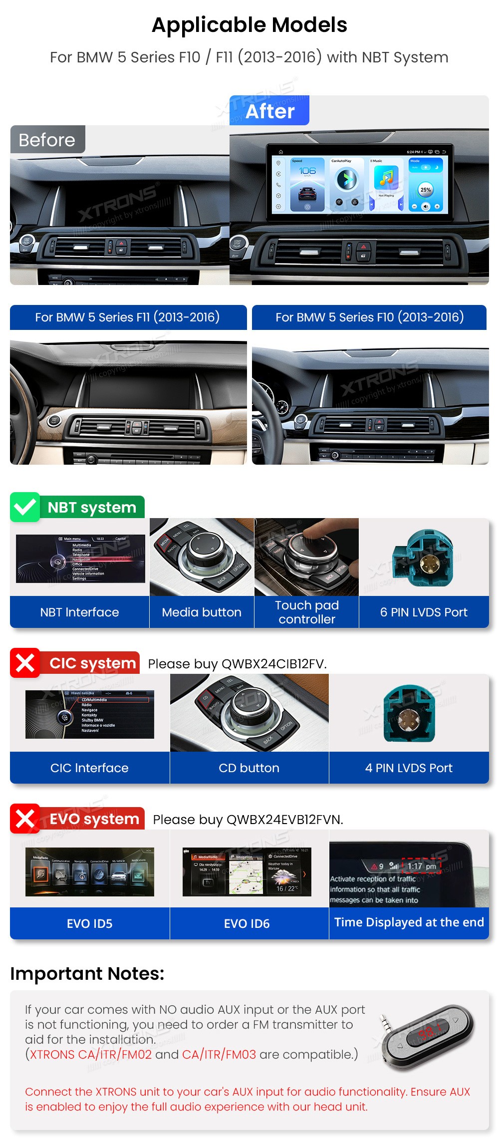 XTRONS QWBX24NB12FV 12.3" BMW 5 Seeria F10, F11 NBT Multimeedia Android Octa-Core 4G BMW 5 Seeria F10 / F11 (2013-2016) (Sobib, kui sõidukil on NBT süsteem.)Tarkvara: Android12.3" HD puuteekraan 2400*900px, IPS HD G+GProtsessor Qualcomm Octa-Core 64bit 2.0GHzMuutmälu DDR4 8GB, UFS2.2 256GB ...Lisaseadmed