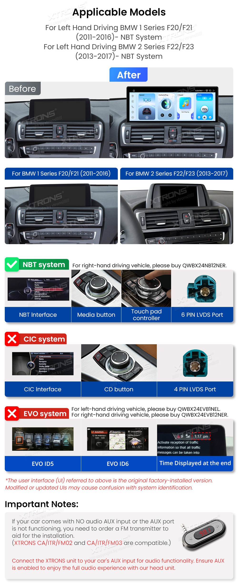 XTRONS QWBX24NB1NEL 12.3" BMW 1, 2 Seeria F20, F21, F22, F23 NBT Multimeedia Android 14 Octa-Core 4G BMW 1 Seeria F20, F21 (2011-2016)BMW 2 Seeria F22, F23 (2013-2017)(Sobib, kui sõidukil on NBT süsteem.)Tarkvara: Android 1412.3" HD puuteekraan 2400*900px, IPS HD G+GProtsessor Qualcomm Snapdragon 68 ...Lisaseadmed