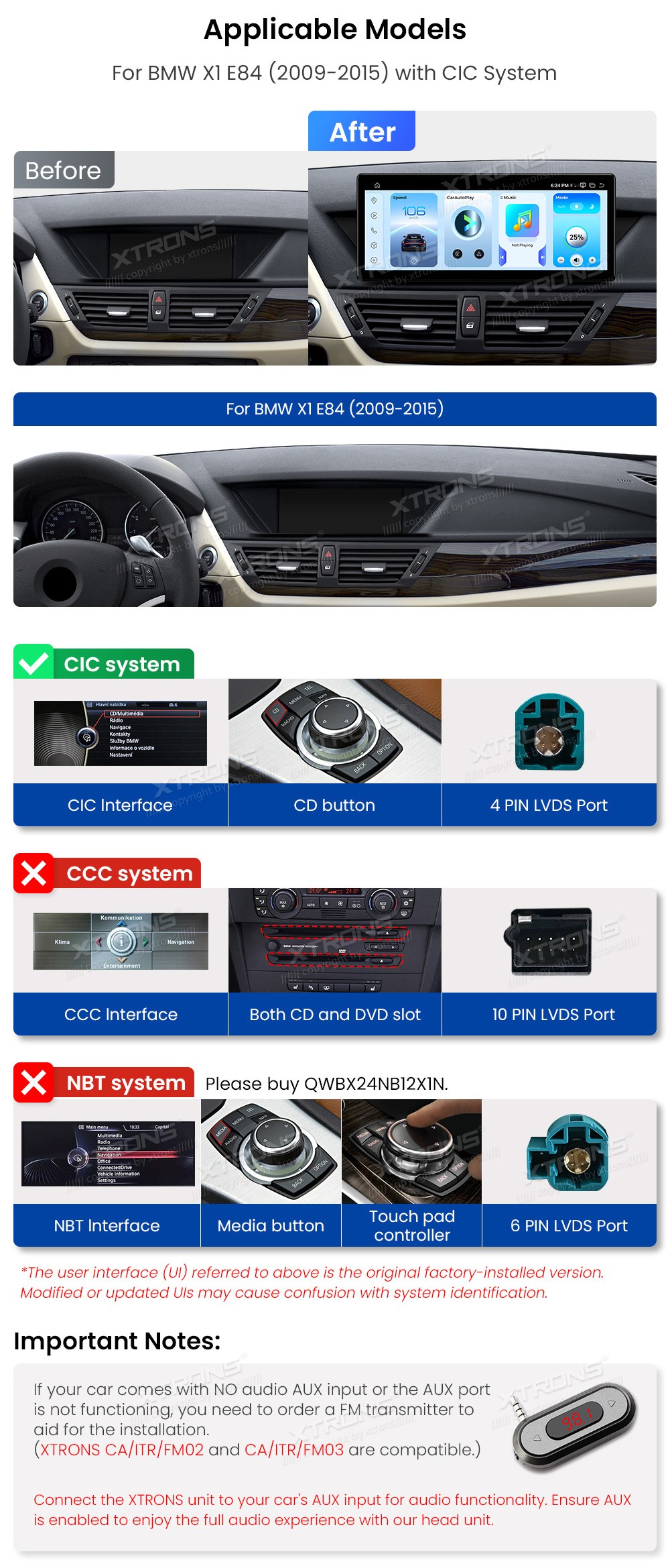 XTRONS QWBX24CIB12X1 12.3" BMW X1 E84 CIC Multimeedia Android 14 Octa-Core 4G BMW X1 E84 (2009-2015) (Sobib, kui sõidukil on CIC süsteem.)Tarkvara: Android 1412.3" HD puuteekraan 2400*900px, IPS HD G+GProtsessor Qualcomm Snapdragon 685 Octa-Core 64bit 2.8GHzMuutmälu DDR4 8GB, UFS2.2 256GB ...Lisaseadmed