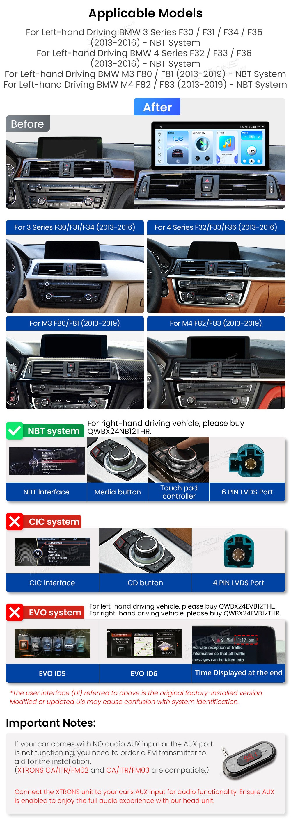 XTRONS QWBX24NB12THL 12.3" BMW 3, 4 Seeria M3, M4 NBT Multimeedia Android 14 Octa-Core 4G BMW 3 Series F30, F31, F34, F35 (2013-2016)BMW 4 Series F32, F33, F36 (2013-2016)BMW M3 F80, F81 (2013-2019)BMW M4 F82, F83 (2013-2019)(Sobib, kui sõidukil on NBT süsteem.)Tarkvara: Android 1412.3" HD puut ...Lisaseadmed