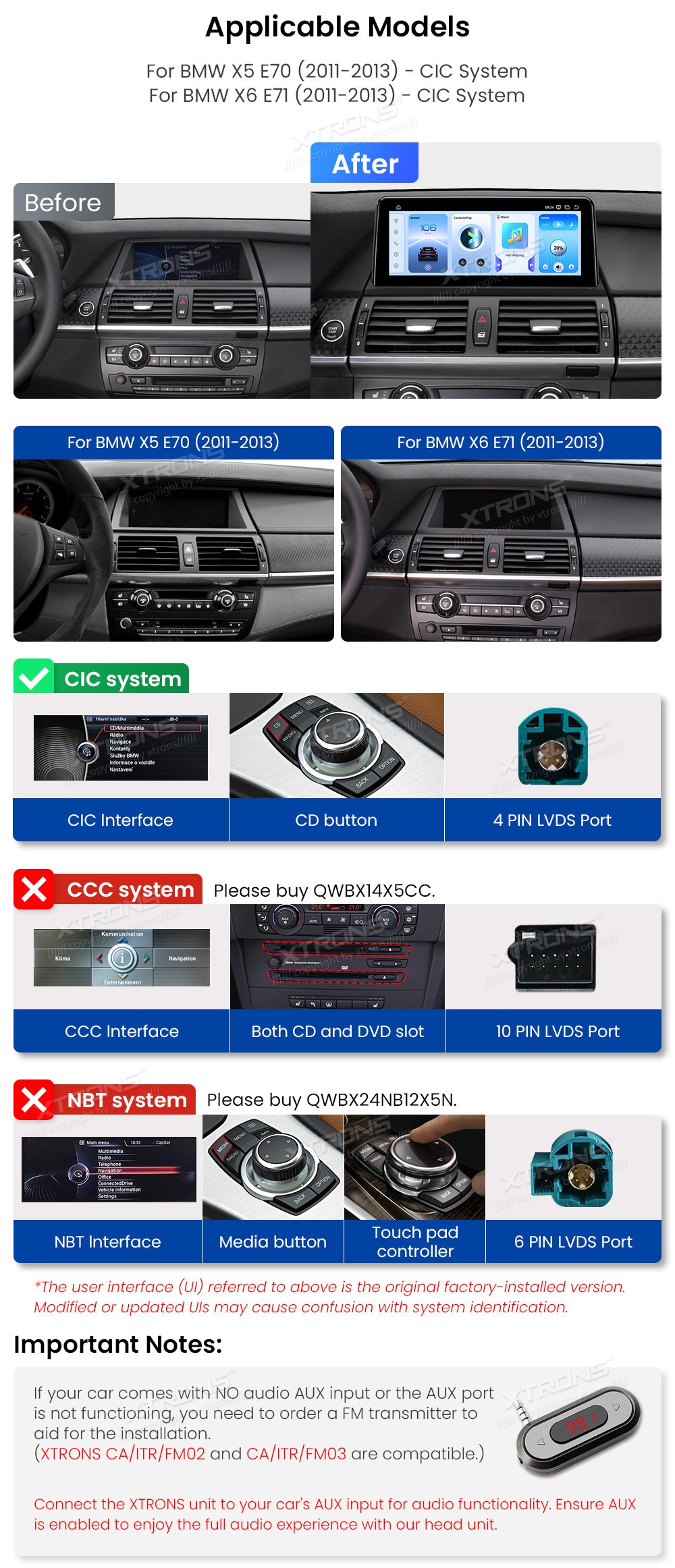 XTRONS QWBX14X5CI 10.25" BMW X5 E70, X6 E71, CIC Multimeedia Android 14 Octa-Core 4G BMW X5 E70 (2011-2013)BMW X6 E71 (2011-2013)(Sobib, kui sõidukil on CIC süsteem.)Tarkvara: Android 1410.25" HD puuteekraan 1920*720px, IPS HD G+GProtsessor Qualcomm Snapdragon 685 Octa-Core 64bit 2.8GHzMuutmälu DDR4 ...Lisaseadmed