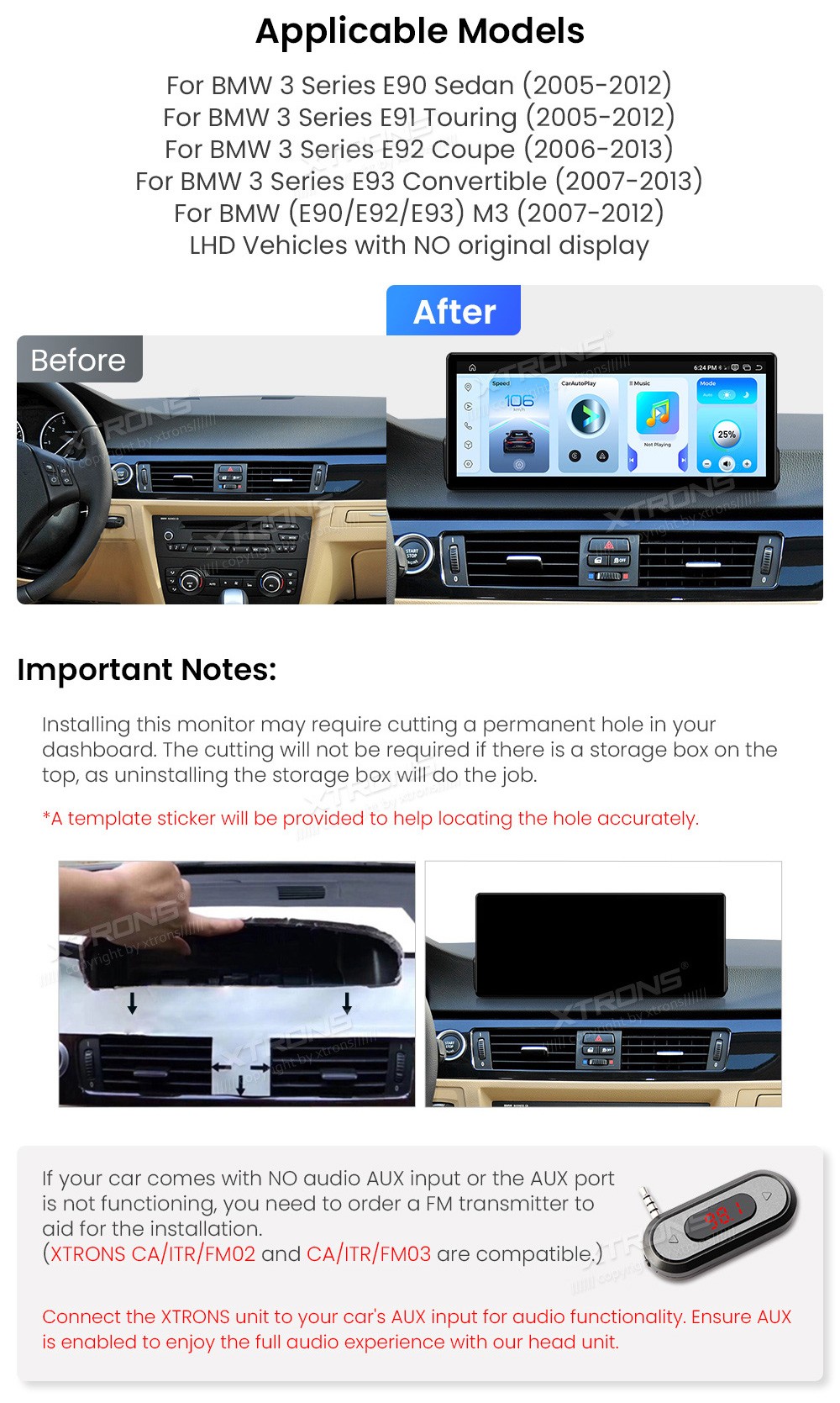 XTRONS QWBX24UMB12E90L 12.3" BMW 3 Seeria E90, E91, E92, E93 Multimeedia Android 14 Octa-Core 4G BMW 3 Seeria E90 Sedan (2005-2012)BMW 3 Seeria E91 Touring (2005-2012)BMW 3 Seeria E92 Coupe (2006-2013)BMW 3 Seeria E93 Convertible (2007-20013)BMW (E90, E92, E93) M3 (2007-2012) (Kui autol pu ...Lisaseadmed