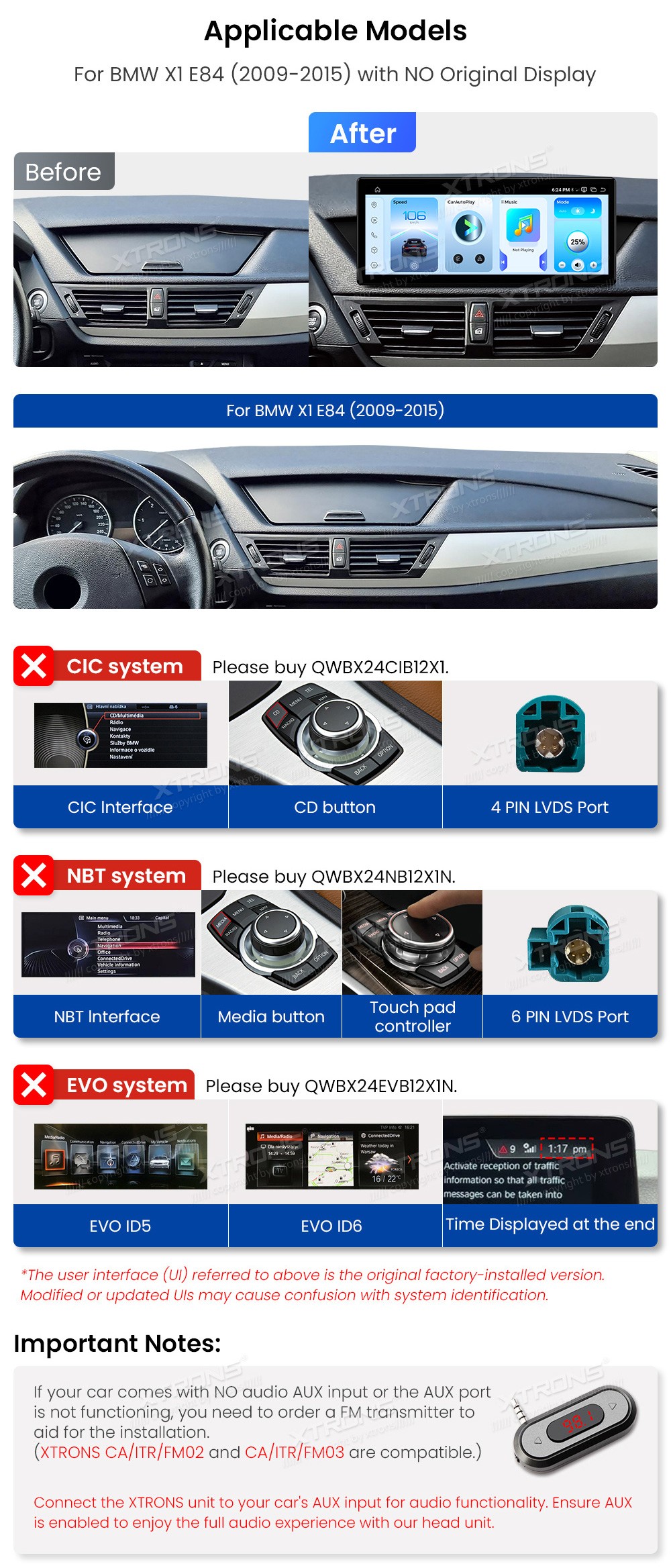XTRONS QWBX24UMB12X1 12.3" BMW X1 E84 Multimeedia Android 14 Octa-Core 4G BMW X1 E84 (2009-2015) (Kui autol puudub originaalne ekraan.)Tarkvara: Android 1412.3" HD puuteekraan 2400*900px, IPS HD G+GProtsessor Qualcomm Snapdragon 685 Octa-Core 64bit 2.8GHzMuutmälu DDR4 8GB, UFS2.2 256GB si ...Lisaseadmed
