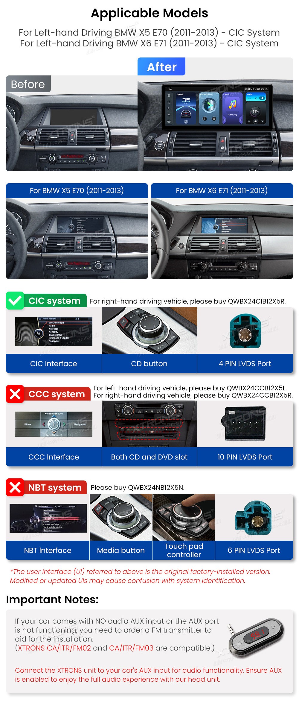 XTRONS QWBX24CIB12X5L 12.3" BMW X5 E70, X6 E71 CIC Multimeedia Android 14 Octa-Core 4G BMW X5 E70 (2011-2013)BMW X6 E71 (2011-2013)(Sobib, kui sõidukil on CIC süsteem.)Tarkvara: Android 1412.3" HD puuteekraan 2400*900px, IPS HD G+GProtsessor Qualcomm Snapdragon 685 Octa-Core 64bit 2.8GHzMuutmäl ...Lisaseadmed
