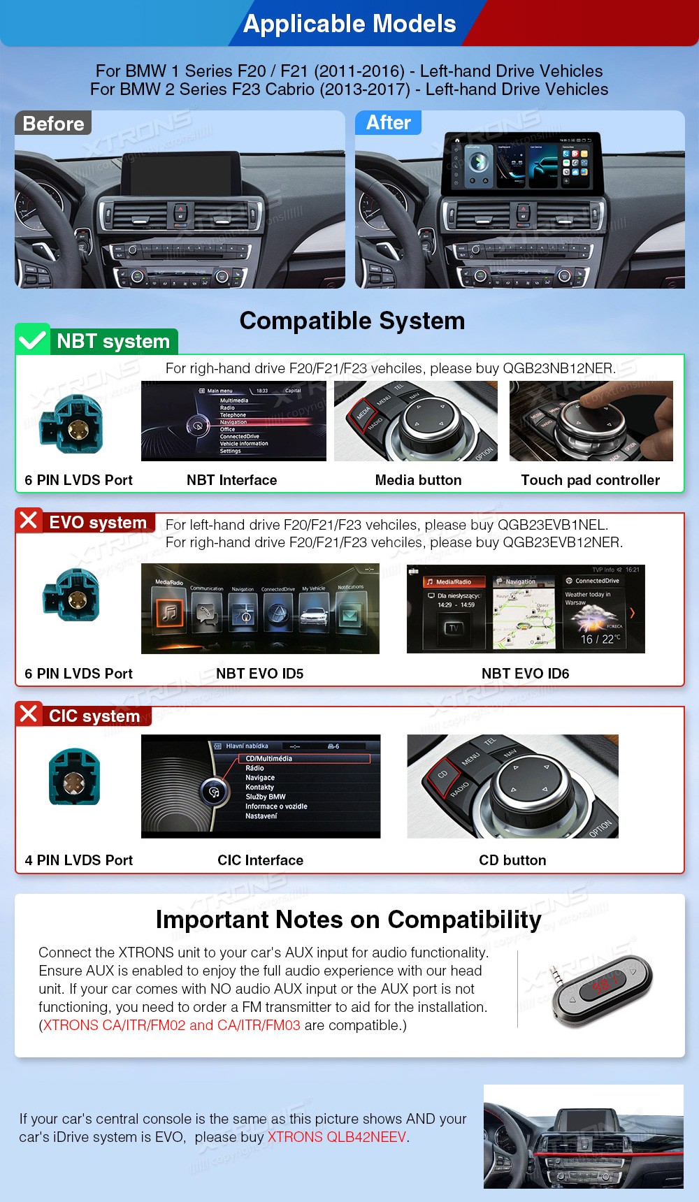 XTRONS QGB24NB1NEL 12.3" BMW 1, 2 Seeria, F20, F21, F23 Cabrio NBT Multimeedia Android 14.0 Octa-Core 4G BMW 1 Seeria F20, F21 (2011-2016)BMW 2 Seeria F23 Cabrio (2013-2017)(Sobib, kui sõidukil on NBT süsteem.)Tarkvara: Android 14.012.3" 2400*900px, 60Hz, IPS G+G HD puuteekraanProtsessor Octa-Core Q ...Lisaseadmed