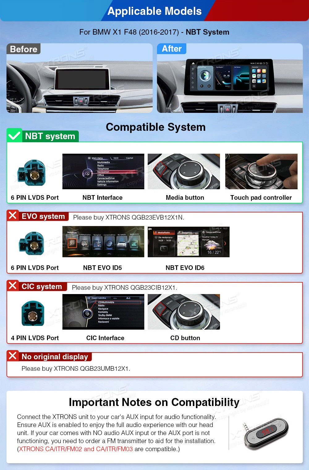 XTRONS QGB24NB12X1N 12.3" BMW X1 F48 NBT Multimeedia Android 14.0 Octa-Core 4G BMW X1 F48 (2016-2017) (Sobib, kui sõidukil on NBT süsteem.)Tarkvara: Android 14.012.3" 2400*900px, 60Hz, IPS G+G HD puuteekraanProtsessor Octa-Core Qualcomm Kryo 256 2.4GHz 64bit, 6nmMuutmälu LPDDR4 8GB, UFS2.2 128GB sis ...Lisaseadmed