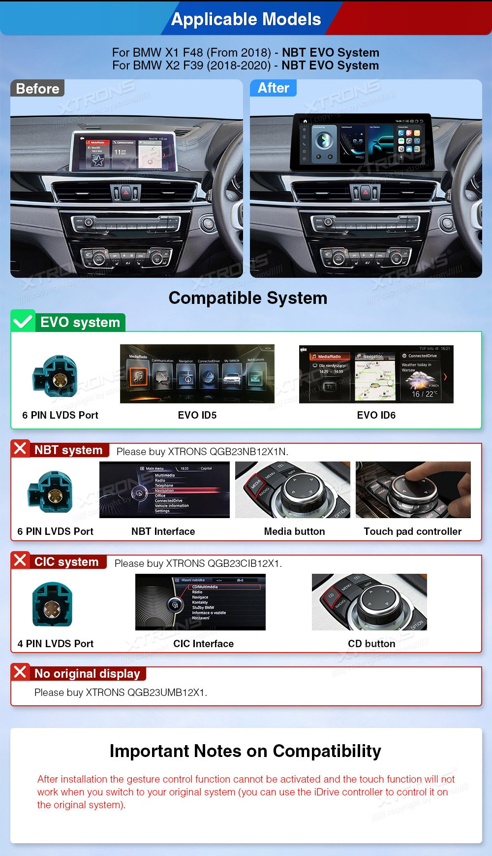 XTRONS QGB24EVB12X1N 12.3" BMW X1 F48 EVO Multimeedia Android 14.0 Octa-Core 4G BMW X1 F48 (2018- ) (Sobib, kui sõidukil on EVO süsteem.)Tarkvara: Android 14.012.3" 2400*900px, 60Hz, IPS G+G HD puuteekraanProtsessor Octa-Core Qualcomm Kryo 256 2.4GHz 64bit, 6nmMuutmälu LPDDR4 8GB, UFS2.2 128GB ...Lisaseadmed