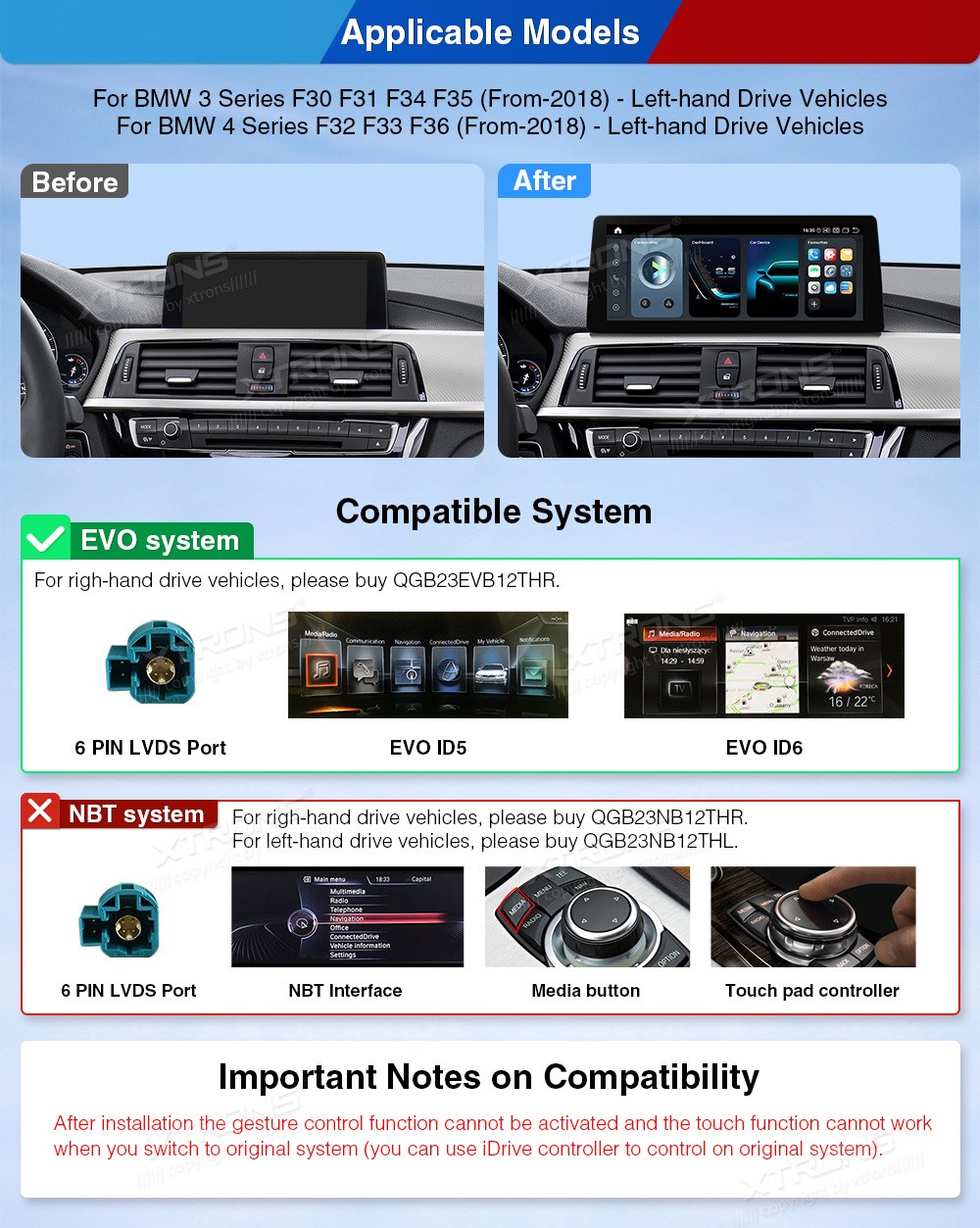 XTRONS QGB24EVB12THL 12.3" BMW 3, 4 Seeria EVO Multimeedia Android 14.0 Octa-Core 4G BMW 3 Seeria F30, F31, F34, F35 (2018-)BMW 4 Seeria F32, F33, F36 (2018-)(Sobib, kui sõidukil on NBT EVO süsteem.)Tarkvara: Android 14.012.3" 2400*900px, 60Hz, IPS G+G HD puuteekraanProtsessor Octa-Core Qu ...Lisaseadmed