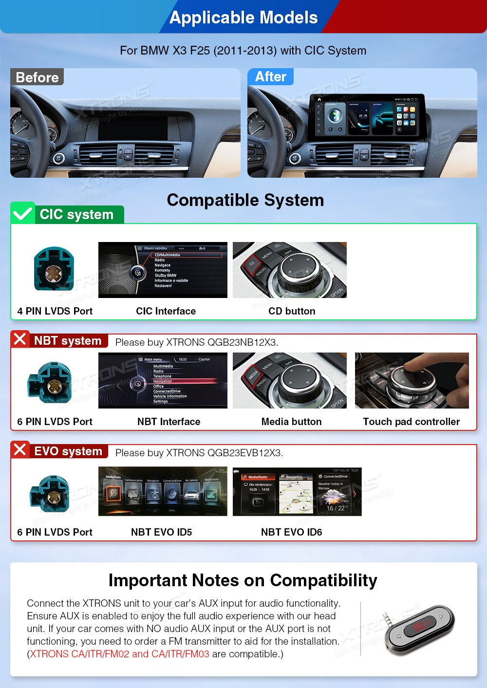 XTRONS QGB24CIB12X3 12.3" BMW X3 F25 CIC Multimeedia Android 14.0 Octa-Core 4G BMW X3 F25 (2011-2013) (Sobib, kui sõidukil on CIC süsteem.)Tarkvara: Android 14.012.3" 2400*900px, 60Hz, IPS G+G HD puuteekraanProtsessor Octa-Core Qualcomm Kryo 256 2.4GHz 64bit, 6nmMuutmälu LPDDR4 8GB, UFS2.2 128G ...Lisaseadmed