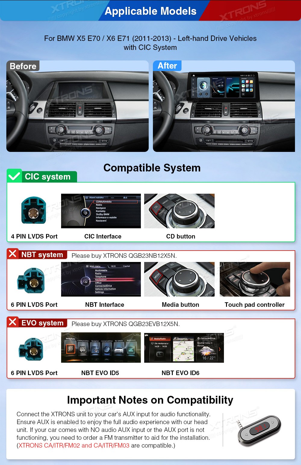 XTRONS QGB24CIB12X5L 12.3" BMW X5 E70, X6 E71 CIC Multimeedia Android 14.0 Octa-Core 4G BMW X5 E70 (2011-2013)BMW X6 E71 (2011-2013)(Sobib, kui sõidukil on CIC süsteem.)Tarkvara: Android 14.012.3" 2400*900px, 60Hz, IPS G+G HD puuteekraanProtsessor Octa-Core Qualcomm Kryo 256 2.4GHz 64bit, 6nmMuutmäl ...Lisaseadmed