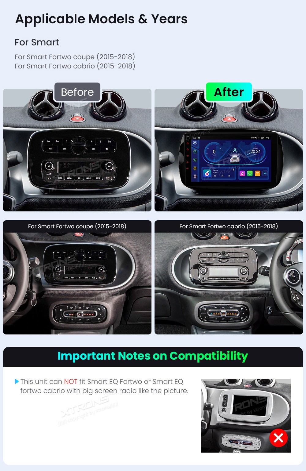 XTRONS IDSP90MSMTN 9.0" Smart Fortwo Coupe/ Cabrio Multimeedia Android Octa-Core Smart Fortwo Coupe/ Cabrio 2015-2018Tarkvara: Android9.0" HD puuteekraan 1280*720px, G+G IPSProtsessor 8xCortex-A55 Octa-Core 64bitMuutmälu 2GB, 64GB sisemäluGPS NavigatsioonCAR AutoPlay (Bluetooth ja USB) AndroidAuto ( ...Lisaseadmed