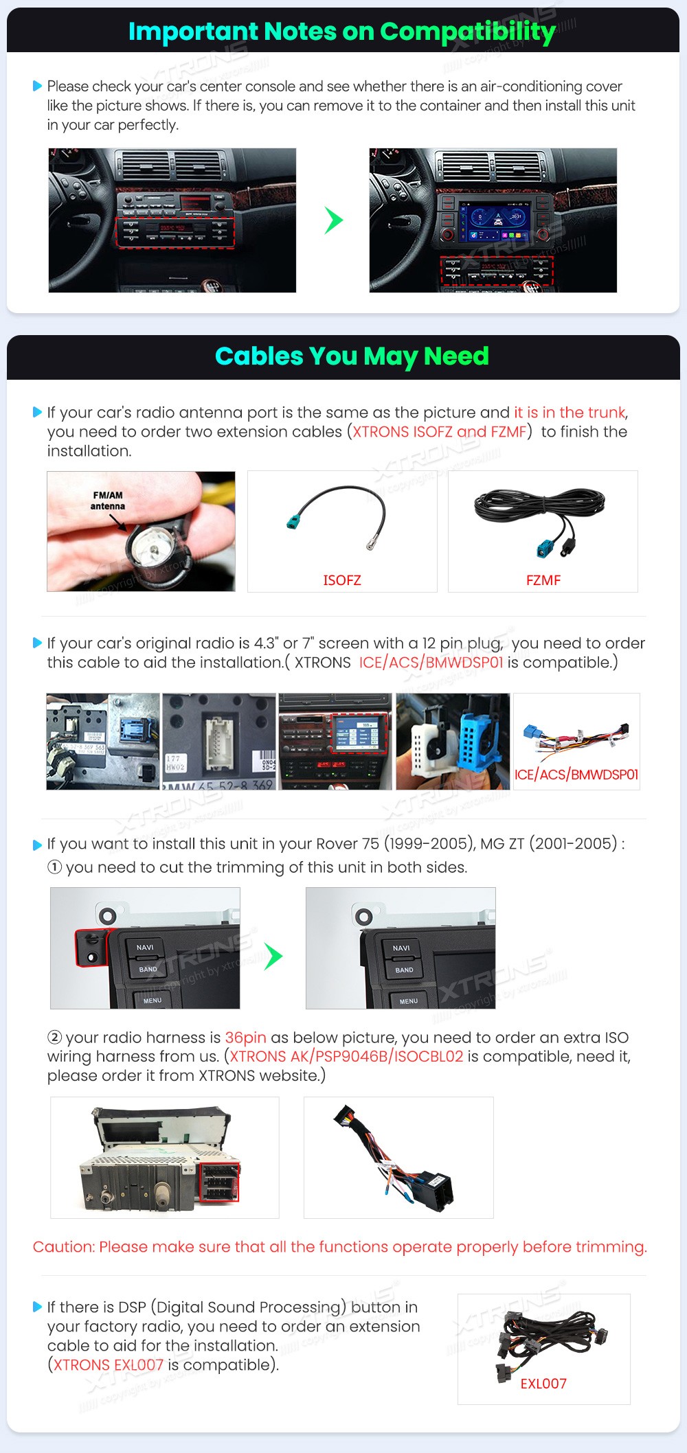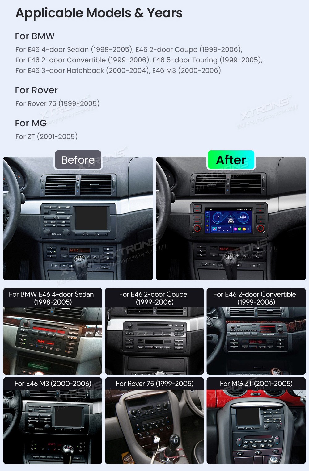 XTRONS IDS7046BL 7.0" BMW E46/Rover/MG Multimeedia Android Octa-Core BMW E46 4-door Sedan (1998-2005), E46 2-door Coupe; (1999-2006), E46 2-door Convertible (1999-2006), E46 5-door Touring (1999-2005), E46 3-door Hatchback (2000- 2004), E46 M3 (2000-2006)Rover 75 (1999-2005)MG ZT (2001 ...Lisaseadmed