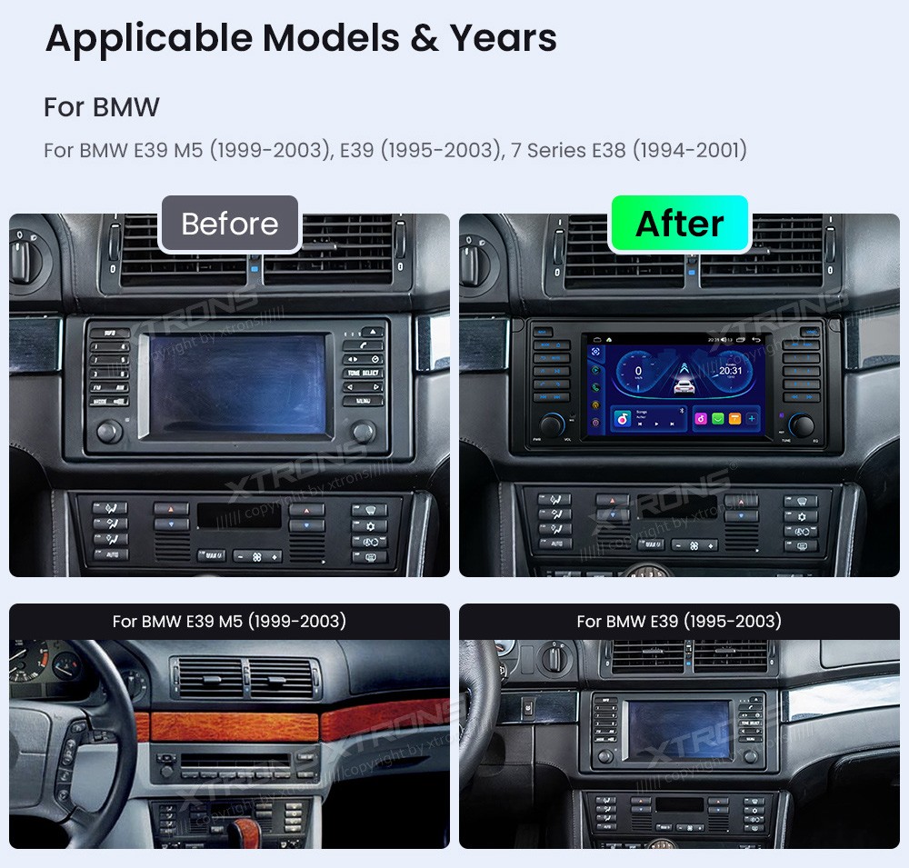 XTRONS IDS7039BL 7.0" BMW E39, M5, E38 Multimeedia Android Octa-Core BMW E39 M5 (1999-2003), BMW E39 (1995-2003), BMW 7 E38 (1994-2001)Tarkvara: Android7.0" HD puuteekraan 1024*600px, G+G IPSProtsessor 8xCortex-A55 Octa-Core 64bitMuutmälu 2GB, 64GB sisemäluGPS NavigatsioonCAR AutoPlay (Blu ...Lisaseadmed