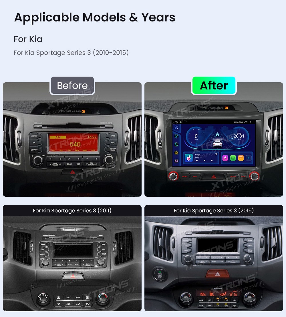 XTRONS IDSP90SPK 9.0" Kia Sportage Multimeedia Android Octa-Core Kia Sportage Series 3 2010-2015Tarkvara: Android9.0" HD puuteekraan 1280*720px, G+G IPSProtsessor 8xCortex-A55 Octa-Core 64bitMuutmälu 2GB, 64GB sisemäluGPS NavigatsioonCAR AutoPlay (Bluetooth ja USB) AndroidAuto (Bluetooth j ...Lisaseadmed