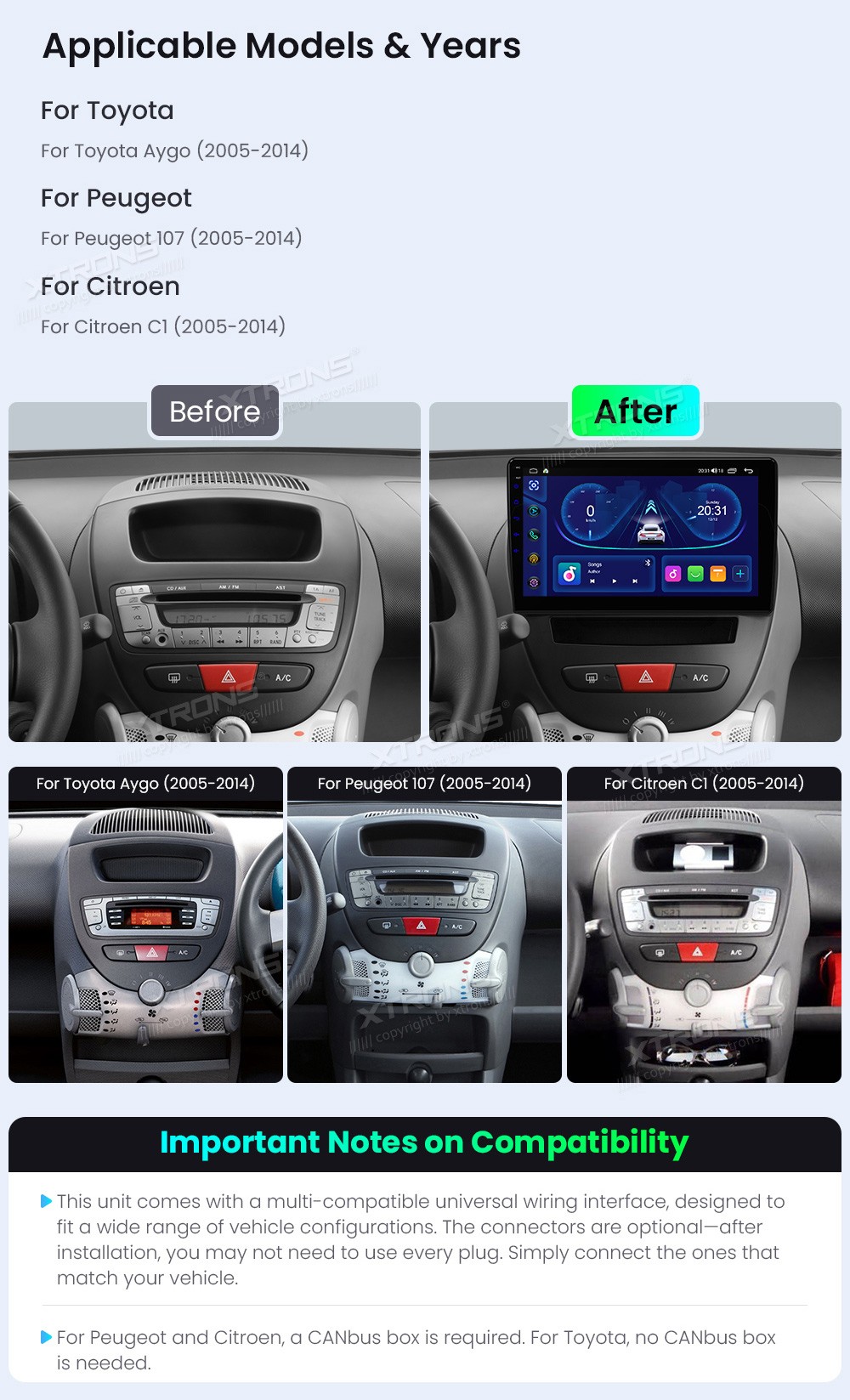 XTRONS IDSP10AGT 10.1" Citroen C1 Multimeedia Android Octa-Core Toyota Aygo / Peugeot 107 / Citroen C1 (2005-2014)Tarkvara: Android10.1" HD puuteekraan 1280*720px, G+G IPSProtsessor 8xCortex-A55 Octa-Core 64bitMuutmälu 2GB, 64GB sisemäluGPS NavigatsioonCAR AutoPlay (Bluetooth ja USB) AndroidAuto (Bl ...Lisaseadmed