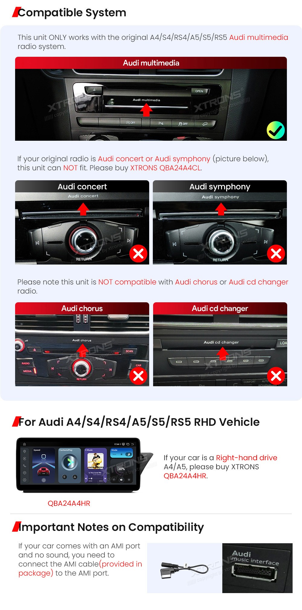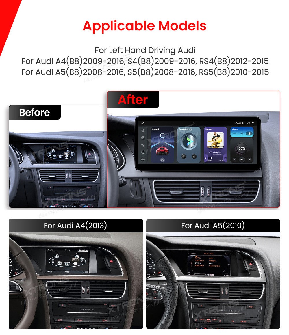 XTRONS QBA24A4HL 12.3" AUDI A4/A5 Multimeedia Android 14 Octa-Core 4G Audi A4, S4 (B8) (2009-2016), RS4 (B8) (2012-2015)Audi A5, S5 (B8) (2008-2016), RS5 (B8) (2010-2015)Tarkvara: Android 1412.3" HD puuteekraan 2400*900px, IPS HD G+G QLEDProtsessor Qualcomm Kryo 260 Octa-Core 64bit 2.0GHzMuutmä ...Lisaseadmed