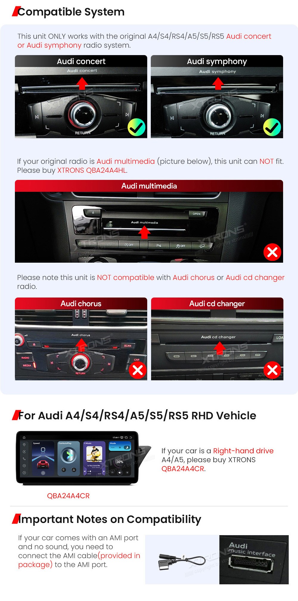 XTRONS QBA24A4CL 12.3" AUDI A4/A5 Multimeedia Android 14 Octa-Core 4G Audi A4, S4 (B8) (2009-2016), RS4 (B8) (2012-2015)Audi A5, S5 (B8) (2008-2016), RS5 (B8) (2010-2015)Tarkvara: Android 1412.3" HD puuteekraan 2400*900px, IPS HD G+G QLEDProtsessor Qualcomm Kryo 260 Octa-Core 64bit 2.0GHzM ...Lisaseadmed