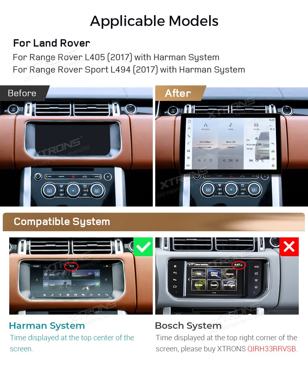 XTRONS QIRH33RRVSH 13.3" Range Rover L405/L494 Multimeedia Android Octa-Core 4G Range Rover L405 / Sport L494 (2017) with Harman SystemTarkvara: Android 1413.3" HD puuteekraan 1920*1080px, IPS HD G+G QLEDProtsessor Qualcomm Octa-Core 4xA73+4xA53 64bit 2.8GHzMuutmälu LPDDR4 8GB, UFS2.2 ...Lisaseadmed