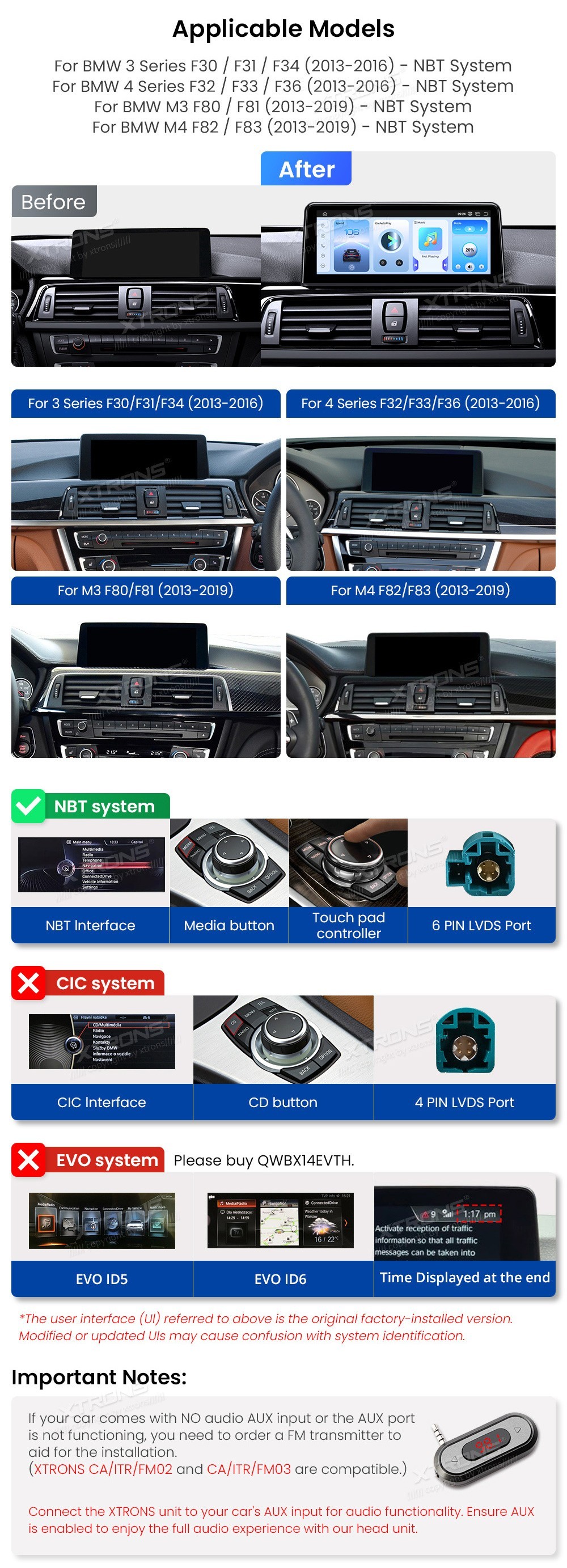XTRONS QBBHW24THNBL 12.3" BMW 3/4/M3/M4 NBT Multimeedia Android 14 Octa-Core 4G BMW 3 Series F30, F31, F34 (2013-2017)BMW 4 Series F32, F33, F36 (2013-2017)BMW M3 F80, F81 (2013-2019)BMW M4 F82, F83 (2013-2019)(Sobib, kui sõidukil on NBT süsteem.)Tarkvara: Android 1412.3" HD puuteekraan 2400*900px, ...