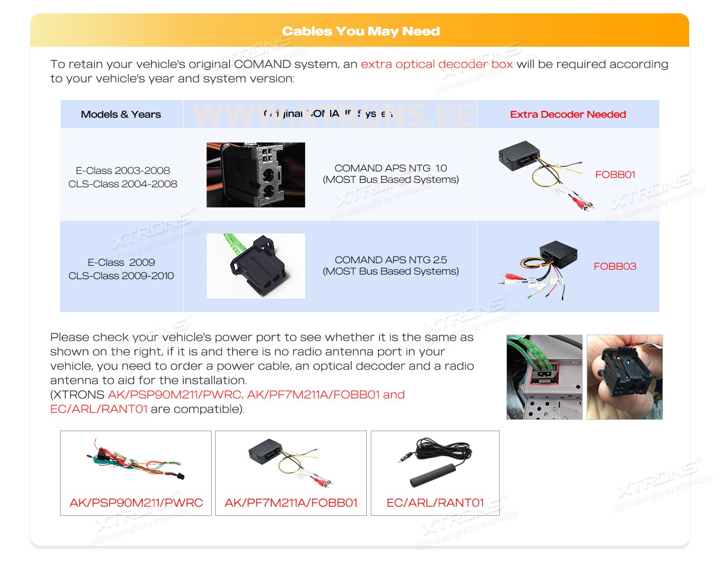 XTRONS FOBB03 Mercedes-Benz E, CLS, SLK, SL, CLK fiiberoptiline adapterPlug-and-Play adapter, mis töötab COMAND APS NTG (Most Bus Based Systems) 2 või COMAND APS NTG 2.5 süsteemiga *Ei tööta, kui autos on D2B Optical Bus System (COMAND 2.0 & COMAND 2.5)...