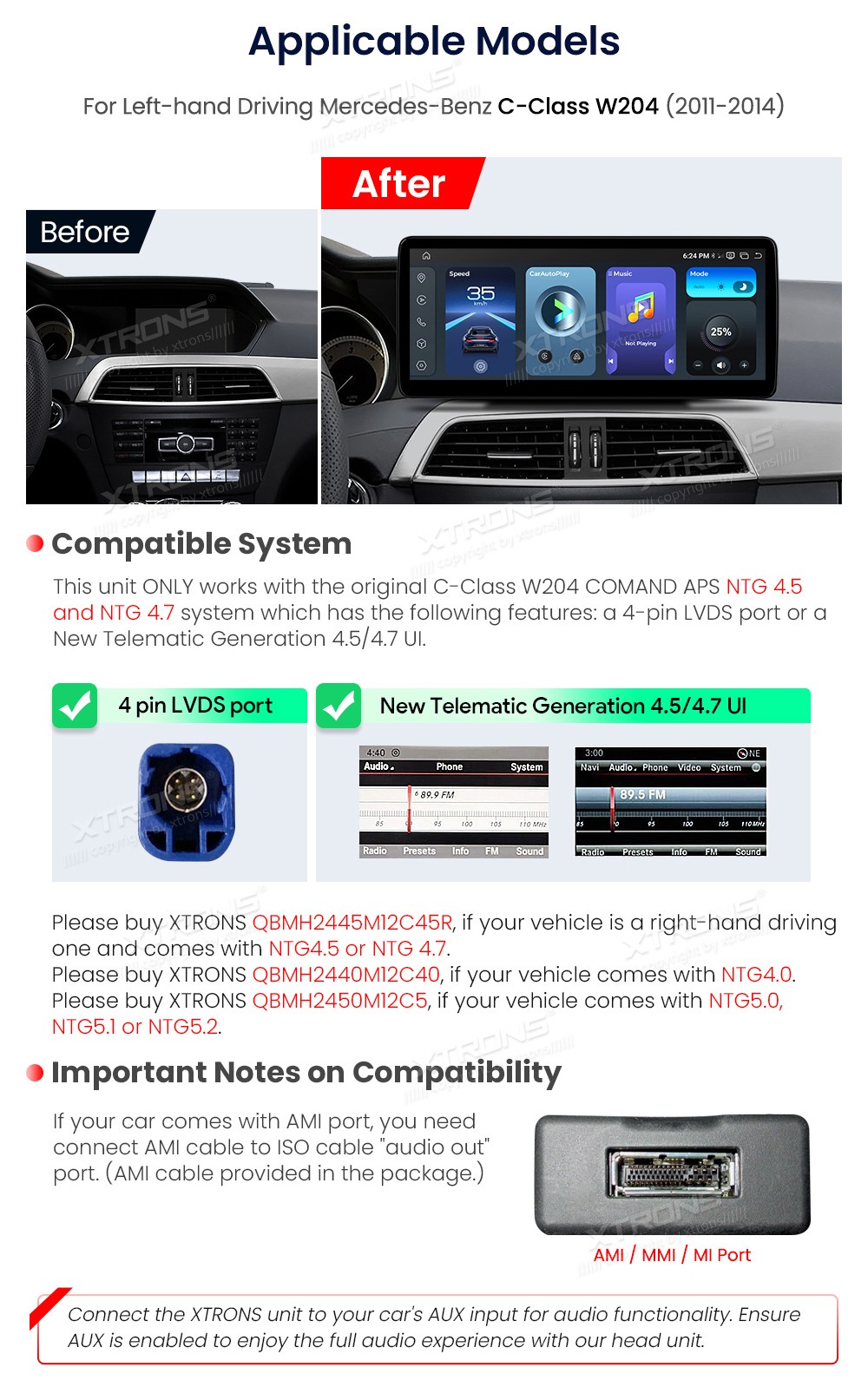 XTRONS QBMH2445M12C45L 12.3" Mercedes-Benz C-Class W204 Multimeedia Android 14.0 Octa-Core Mercedes-Benz C-Class W204 (2011-2014) NTG 4.5, NTG 4.712,3-tolline peegeldus- ja pimestamisvastane 2K ekraan Snapdragon 662 kaheksatuumaline protsessor, 8+128GB mäluga Android-autostereo, multimeedi ...Lisaseadmed