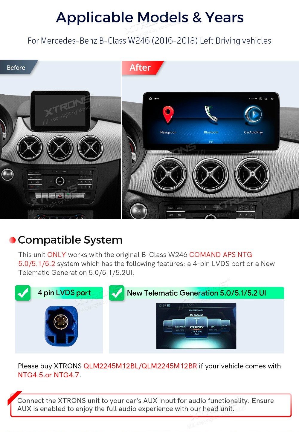 XTRONS QBMH2450M12BL 12.3" Mercedes-Benz B-Class W246 Multimeedia Android 14.0 Octa-Core Mercedes-Benz B-Class W246 (2016-2018) COMAND APS NTG 5.0, NTG 5.1, NTG 5.212,3-tolline Snapdragon 662 kaheksatuumaline protsessor, 8+128 GB Android-autostereo ja nanotekstuuriga 2K-ekraaniga multimeed ...Lisaseadmed